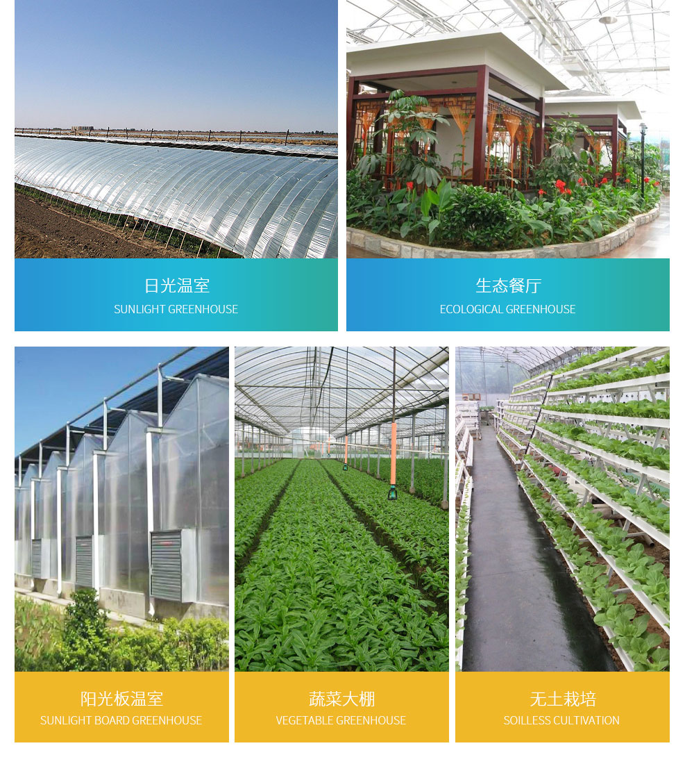 我們的主導產品有:玻璃溫室、智能溫室、陽光板溫室、生態餐廳、日光溫室